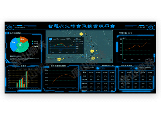 智慧農(nóng)業(yè)管理平臺可實現(xiàn)“一張圖”展示對總用水量變化、費用支出、水電比、行業(yè)用水比、機(jī)井狀態(tài)等數(shù)據(jù),總體掌握年用水量變化趨勢及費用支出比例,為管理決策提供數(shù)據(jù)支撐。